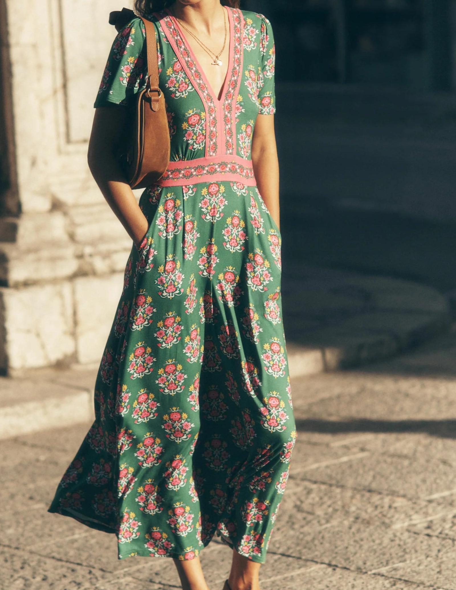 Green Floral Flutter - Sleeve Maxi Tea Dress