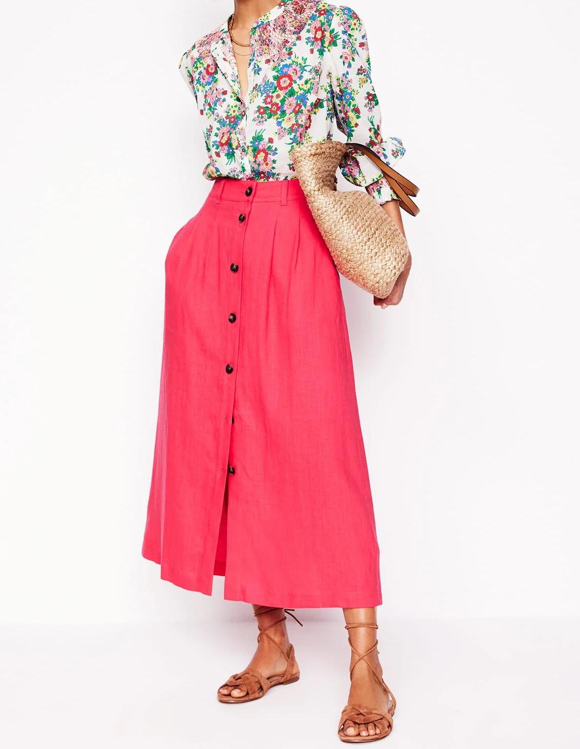 Hot Pink Button - Front Linen Midi Skirt 440481